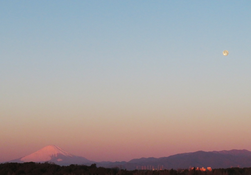 今日の画像は、昨日の夜明頃に撮影した富士山です。日の出の陽光を受けて赤みを帯びた富士山でした。先週の沿岸低気圧がもたらした降雪で南東斜面は裾野迄真っ白になっています。富士山の遥か右上には満月1日後の月が輝いていました。