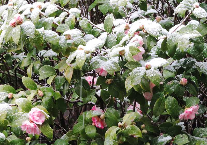 今日の画像は、雪を被った寒椿です。昨日、雪が降り始めた頃に勤務校の正面玄関脇で咲いている寒椿に積り始めた雪です。