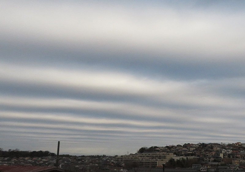 今日の画像は、今朝の空に広がっていた波状雲です。西から東に全天に広がっていました。画像は西の低空部分です。冬の時期には時々見かけます。
