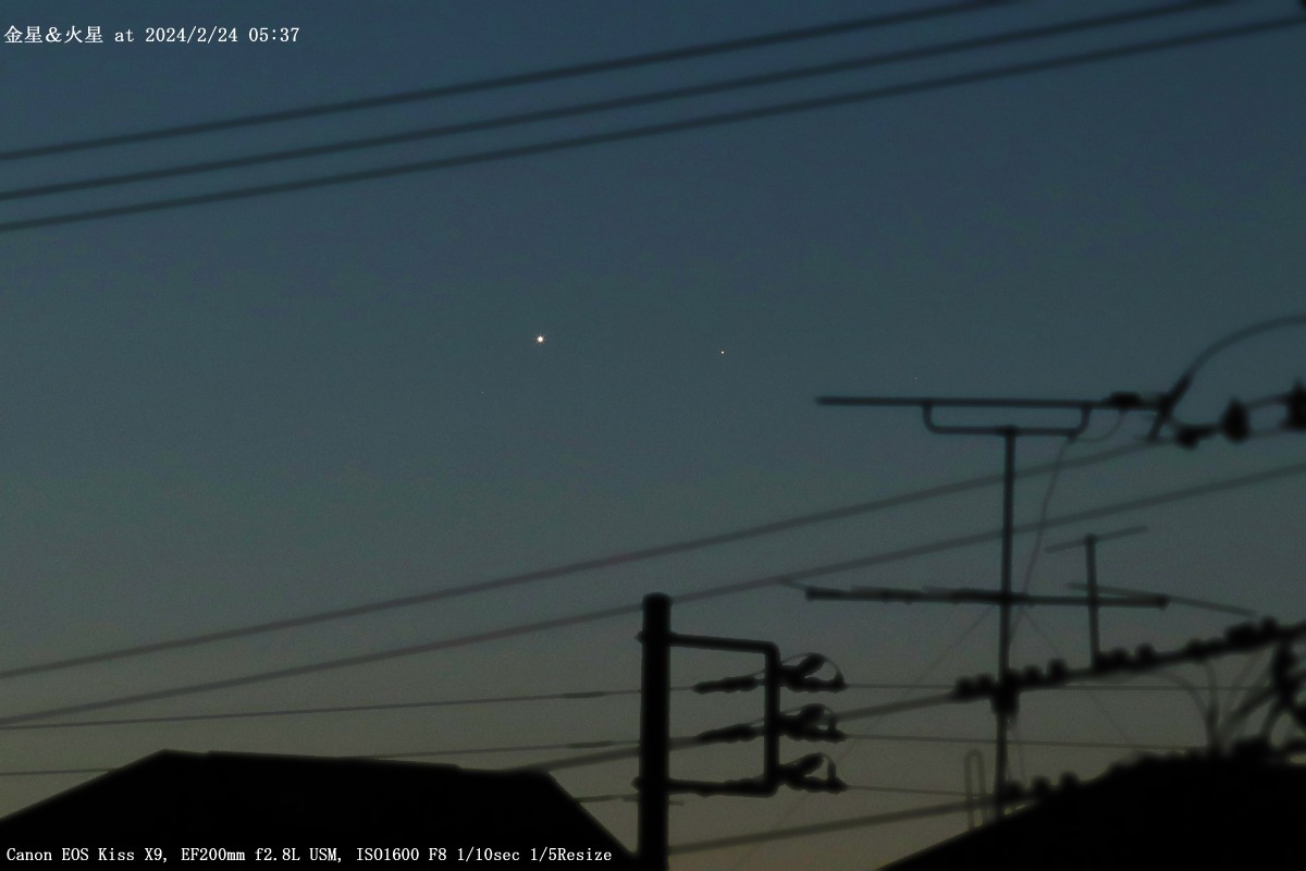 今日の画像は、今朝撮影した金星と火星です。左の明るいのが金星(-3.9等)で右の暗いのが火星(1.3等)です。今朝の5時半過ぎに我が家の屋上で撮影しました。高度が6度近かったので、自宅の屋上でも見える筈と思い、丘の上まで行きませんでしたが、我が家の屋上では低空に電線やご近所のTVアンテナが写り込みました。やはり丘の上まで行くべきだったと反省です。金星と火星の離角は0.9度(満月2個分)とかなり近くに見えていました。