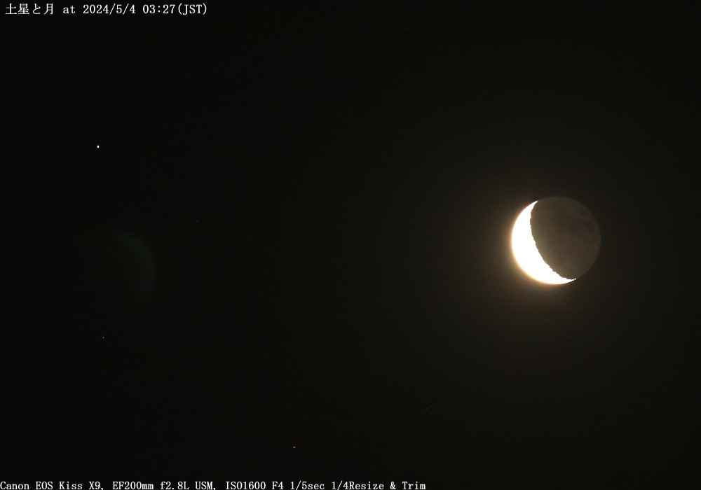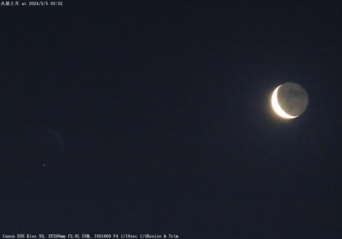 今朝の夜明前、昨日の早朝同様に早起きし、仲良く並んだ月齢26の細い月と火星を撮影しました。火星は画像の左下に写っています。今日の昼頃に火星の前を月が通過する火星食が起きたけど、空が明るい日中なので撮影は難しいので諦めました。火星がもう少し明るい時期なら撮影は楽ですが、火星は1等星とそれほど明るくはないので、しっかり写すのは難しいのです。