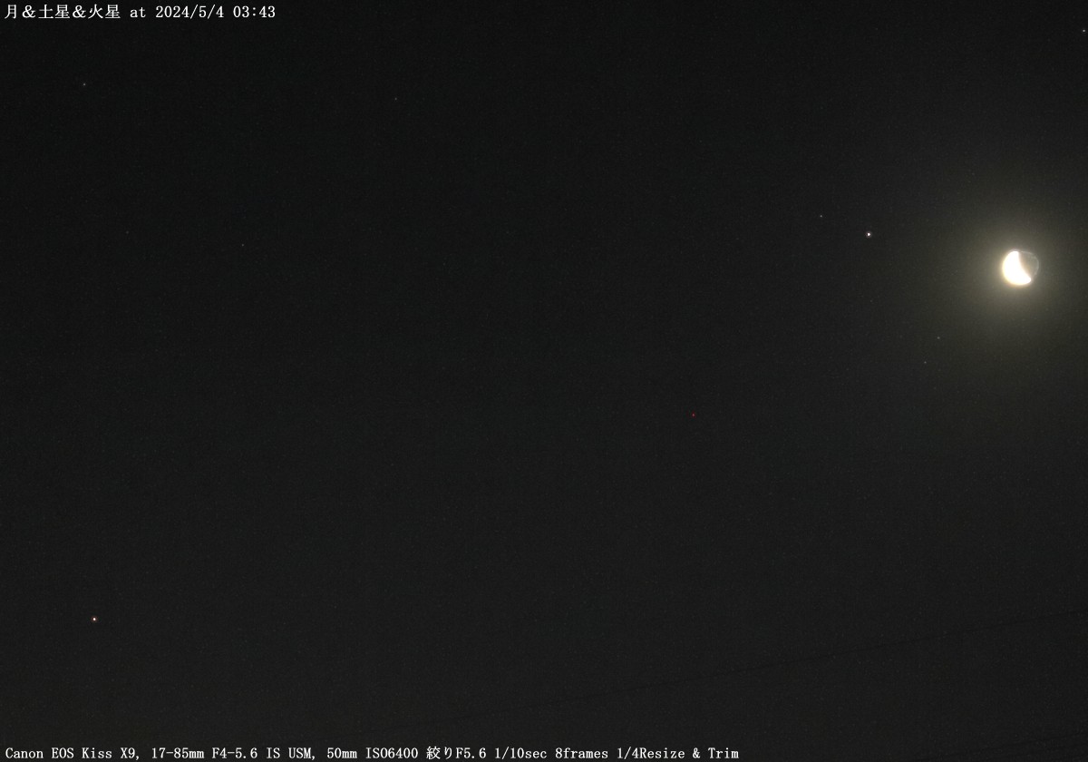 今日の画像は、今朝の夜明前に撮影した月と土星です。夜明前の東南東の低空で月齢25の少し細くなった月と土星が仲良く並んでいました。土星は左端ですが暗いので、右上の小さな画像では判り難いかも。また、月と土星からかなり東に離れた低空には火星も見えていました。火星を入れて50oのレンズで撮影した画像はこちらです。左下隅が火星です。火星もまだ暗いのであまり目立ちません。