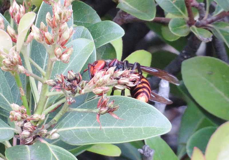 今日の画像は、スズメバチです。先週の日曜日に公園を散歩していたら、体長5cm程の大きなスズメバチが飛んで来て近くの花に止まりました。おとなしいクマバチとは違って危険なので数m離れた場所からコンパクトデジカメの望遠端で1コマ撮影後、素早くその場から離れました。