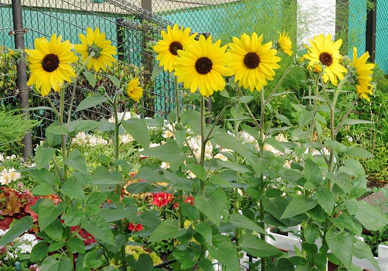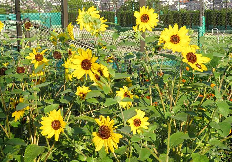 今日の画像は、小さなヒマワリです。近くの公園の花壇では、中位の大きさのヒマワリが終わり、直径10cm程度の小さなヒマワリが咲き誇っています。