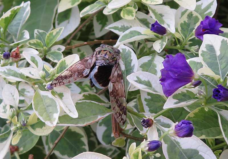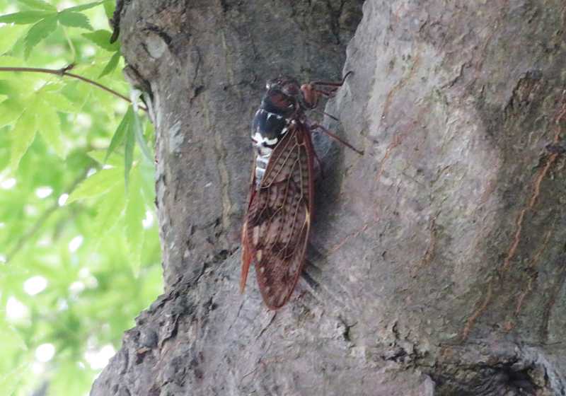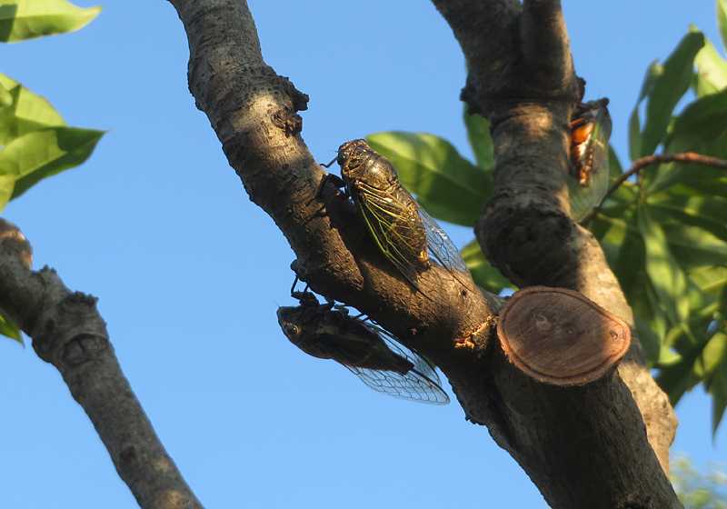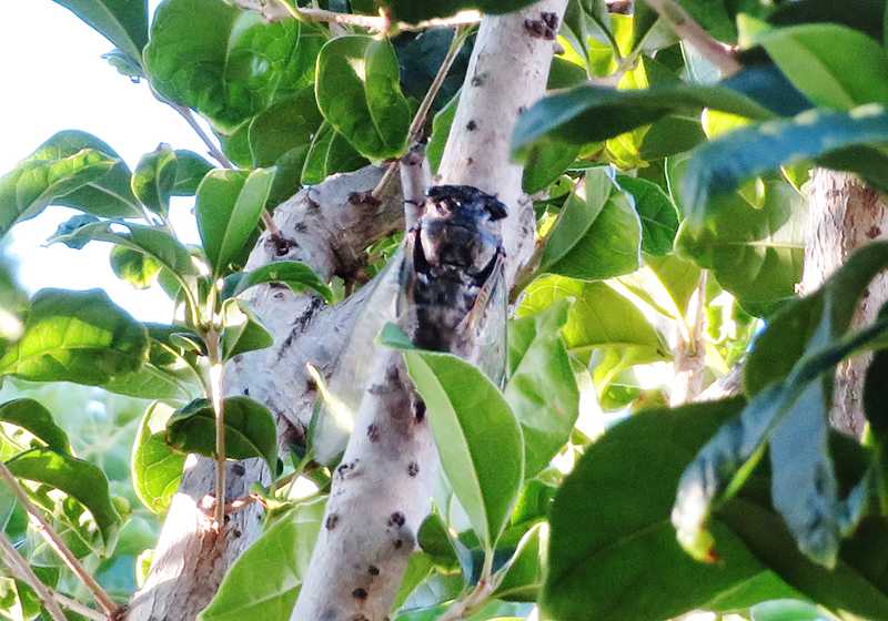 今日の画像は、2匹のクマゼミです。相変わらずクマゼミがうるさく鳴いています。偶然、2匹のクマゼミが同じ場所で鳴いており、うるささ倍増でした。