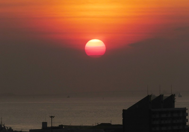 今日の画像は、今朝の朝日です。今日は休みだったので、朝食前に軽い散歩に出ました。東京湾が見える場所に行ったら、低空の雲から朝日が見え始めていたので撮影しました。