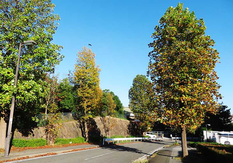 今日の画像は、近くの公園の景色です。一部の落葉樹が黄葉・紅葉し始め、通路は落ち葉が一杯、晩秋の景色です。