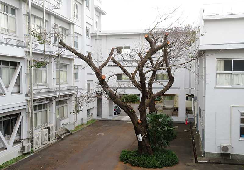 今日の画像は、多くの枝を伐採された勤務校の桜の古木です。学校の中庭に樹齢数十年を越える桜の古木が2本あります。古木なの枯れかかった枝が目立っていたので、先週の金曜日に学校から委託された造園会社が高所作業車を使い、多くの枝を伐採しました。伐採される前に撮影した画像も紹介します。これだけ伐採したら、樹が枯れてしまうのではと心配です。