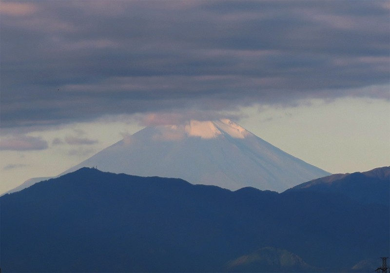 9時頃に青空が広がり出した時、西の低空に晴れ間があり、そこから山頂に真っ白な冠雪が輝く富士山が見えました。出来れば、向かいの丘に行き撮影したかったけど、生憎出かける用事があり、帰宅してから撮影しようと思っていました。でも11時頃に帰宅した時は西の空に雲が広がっており、富士山は見えなくなっていました。