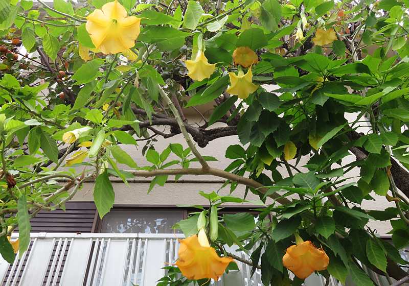 今日の画像は、キダチチョウセンアサガオです。通勤途中の道沿いのお宅の垣根から大きなラッパ状の花が下を向いて咲いています。花が少ない季節なので良く目立ちます。