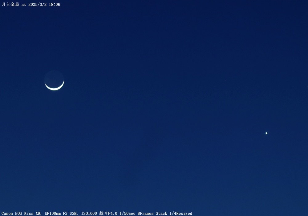 今日の画像は、昨日の日没直後に撮影した月と金星です。夕方の薄曇りで諦めていましたが、日没後に空を確認したら、西の空に月と金星が仲良く並んで見えていたので、100mmの望遠レンズで撮影しました。
