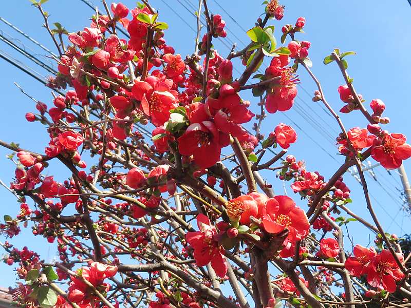 今日の画像は、ボケの花です。ご近所の庭に咲いている真っ赤なボケの花が良く目立っています。