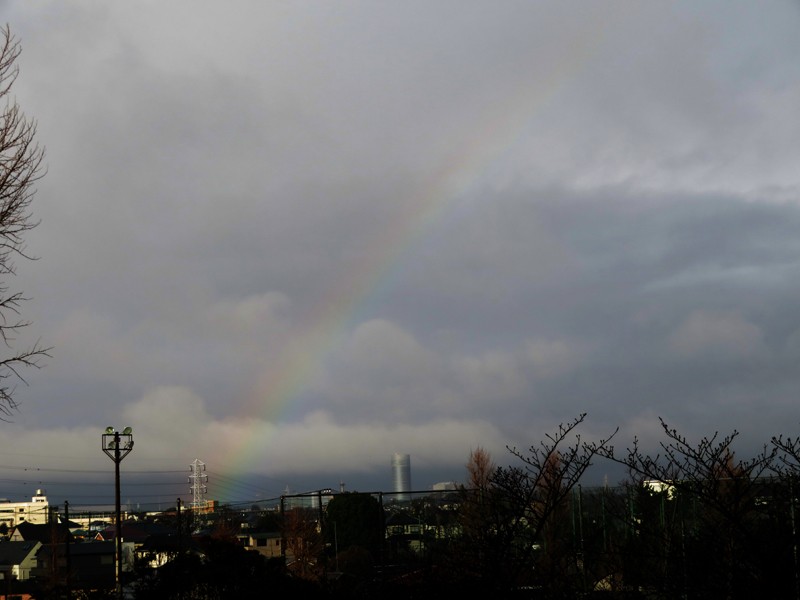 今日の画像は、今朝見えた虹です。勤務校で7時頃、短時間ですがかなりの雪が降りました。その雪が止む頃に、東の空から薄日が射し、反対の西の空に微かですが虹が出ました。
