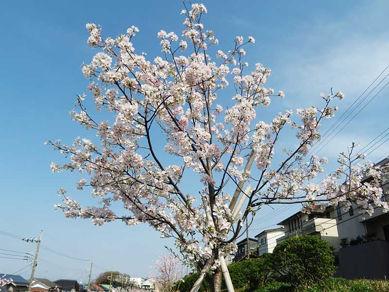 今日の画像は、我が家の近くの小さな桜です。3年前に植えられた若木、まだ太さが数pですが、満開です。