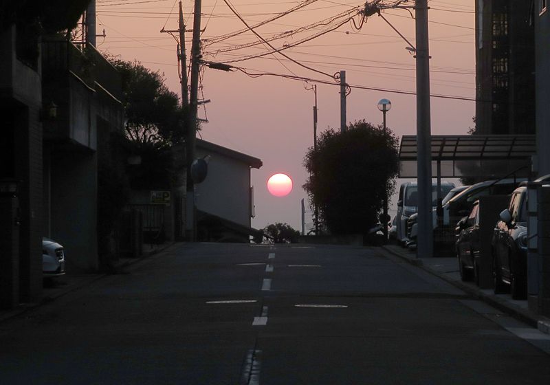 今日の画像は、我が家の近くで撮影した日の出です。先週の土曜日、夜明け頃の早朝ウォーキングで家から真東に向かって数分歩いた場所で、家々の間から登り始めた太陽が見えたので撮影しました。この画像を撮影するちょっと前に撮影した画像も紹介します。