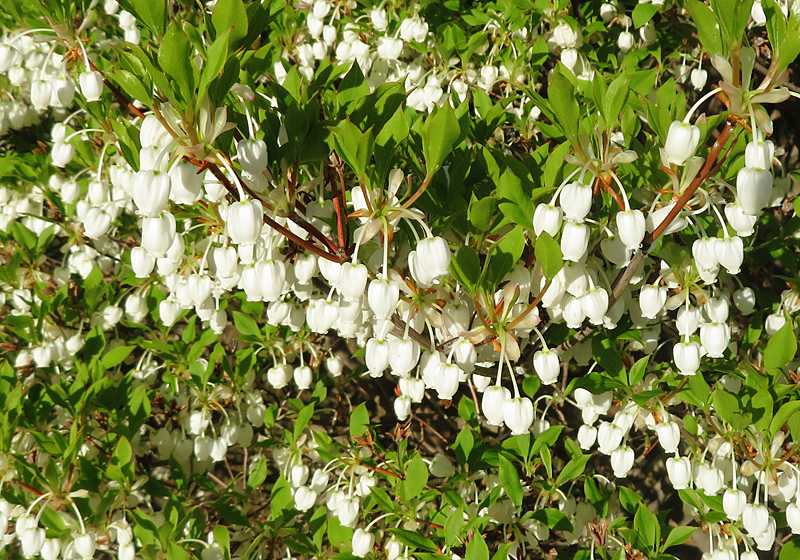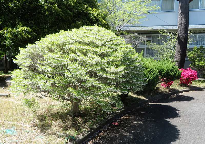 今日の画像は、ドウダンツツジの花です。勤務校の正面玄関脇のドウダンツツジが満開です。樹の全体画像も紹介します。樹の右奥には、一昨日に紹介したツツジが写っています。