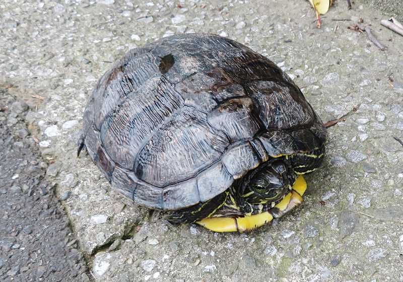 今日の画像は、陸亀です。先日の日曜日、早朝散歩途中の道を亀が歩いていました。甲羅の長さが20p程度で、持ち上げるとズッシリ重たい亀でした。重さや足の形から判断すると多分リクガメでしょう。今まで見たことが無いので、どこかで飼われている亀が脱走したと思われます。