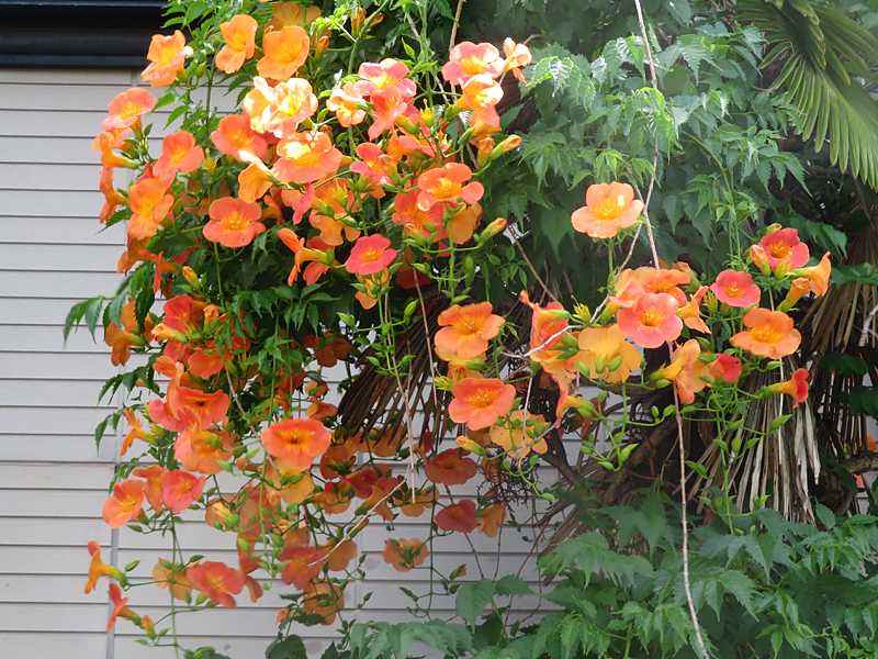 今日の画像は、ノウゼンカズラの花です。梅雨時から咲き始める朱色の目立つ花です。