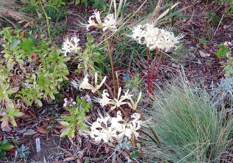 今日の画像は、勤務校の彼岸花です。勤務校の中庭や花壇でも彼岸花が咲いています。中庭の桜の古木の周囲に咲いている彼岸花は、赤い花に混ざって白い花が2輪咲いています。赤と白が混在してこともあるようです。