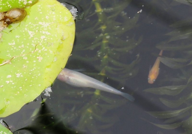 今日の画像は、メダカの親子です。自宅近くにある公園の事務室前に置かれた水鉢で暮らしているメダカ、先月初旬に小さな赤ちゃんメダカが泳いでいました。その赤ちゃんメダカ、一か月で少し大きく成長し、親の近くを泳いでいます。親メダカは白と赤、子供メダカやピンクと白です。
