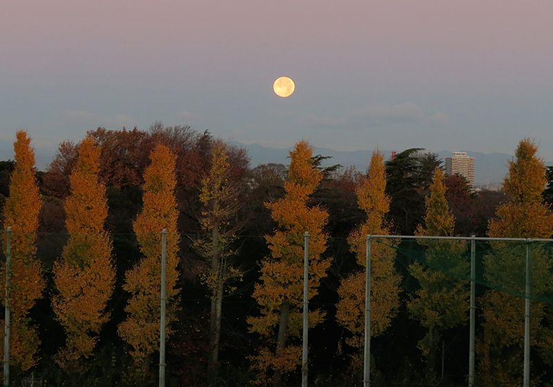 今日の画像は、勤務校の今朝の景色第2弾です。今朝、勤務校に着いた時、満月1日前の丸い月が、校庭の北西方向の低空に浮かんでいました。まだ夜明け前ですが、校庭の周囲の黄葉したイチョウの樹の上に輝く月が素敵でした。