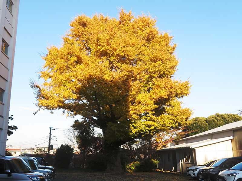 今日の画像は、勤務校の大イチョウです。勤務校のご神木的な大イチョウ、まだ黄葉した葉がビッシリ。他のイチョウの木の葉はほとんど散っているのに、やっと散り始めました段階です。一昨年の夏頃、太く長く育った枝数本が強風と枝自身の重さで、裂けて折れました。その為、他の危なさそうな枝を伐採したり、短くしました。