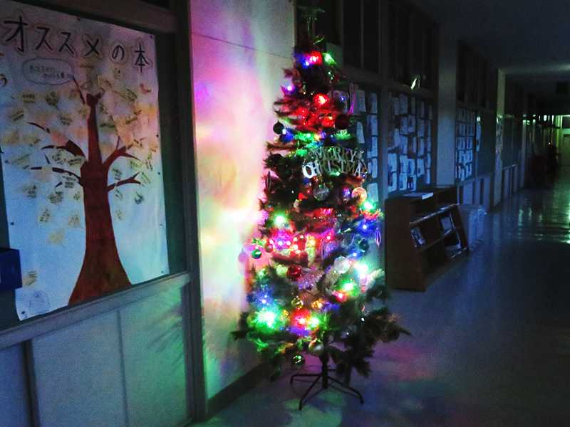 今日の画像は、勤務校のクリスマスツリーです。PTAから寄贈されたイルミネーション付のクリスマスツリー、勤務校の図書室前の廊下に置かれています。