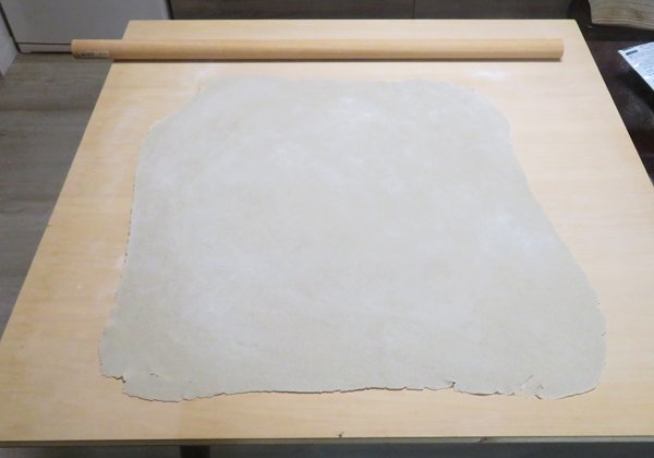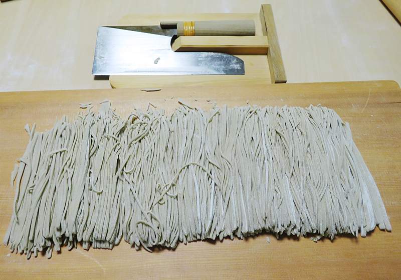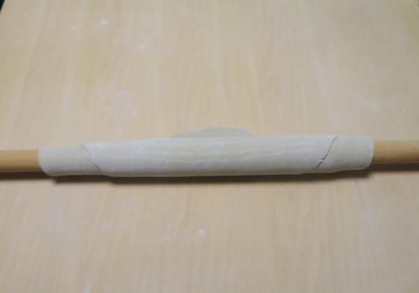 蕎麦粉に水を加え、コネて丸め12〜13cmの玉を造ります。それを手での延ばして直径25cm程度の円盤にし、麺棒で延ばして最終的に70cm角程度まで伸ばせば完成です。時間にして約45分です。それを2回でした。